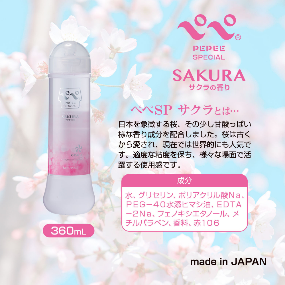 世界中で人気のぺぺSPシリーズ。日本を感じる和"の香りを詰め込んだローションが新登場です。このぺぺSPサクラは「一瞬の美」や「特別な時間」を連想させる、日本人にとって特別な香りです。桜の香りは海外でも「日本」を象徴する香りとして知られており、伝統的な香りとして人気を博しています。強すぎないほんのりとした甘さが特徴で、上品でやわらかい印象です。どこかノスタルジックで、ほんの少しの切なさも演出できるでしょう。粘度は人気の高い中粘度、しっかりとした使用感を感じさせてくれます。持続性もあり、男女の営みにもフィットします。日本国内の工場で生産された安心の品質。ぜひお試しください